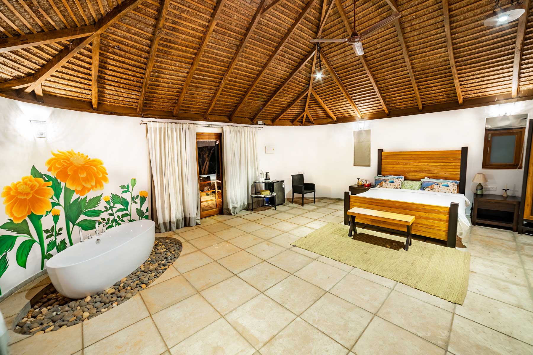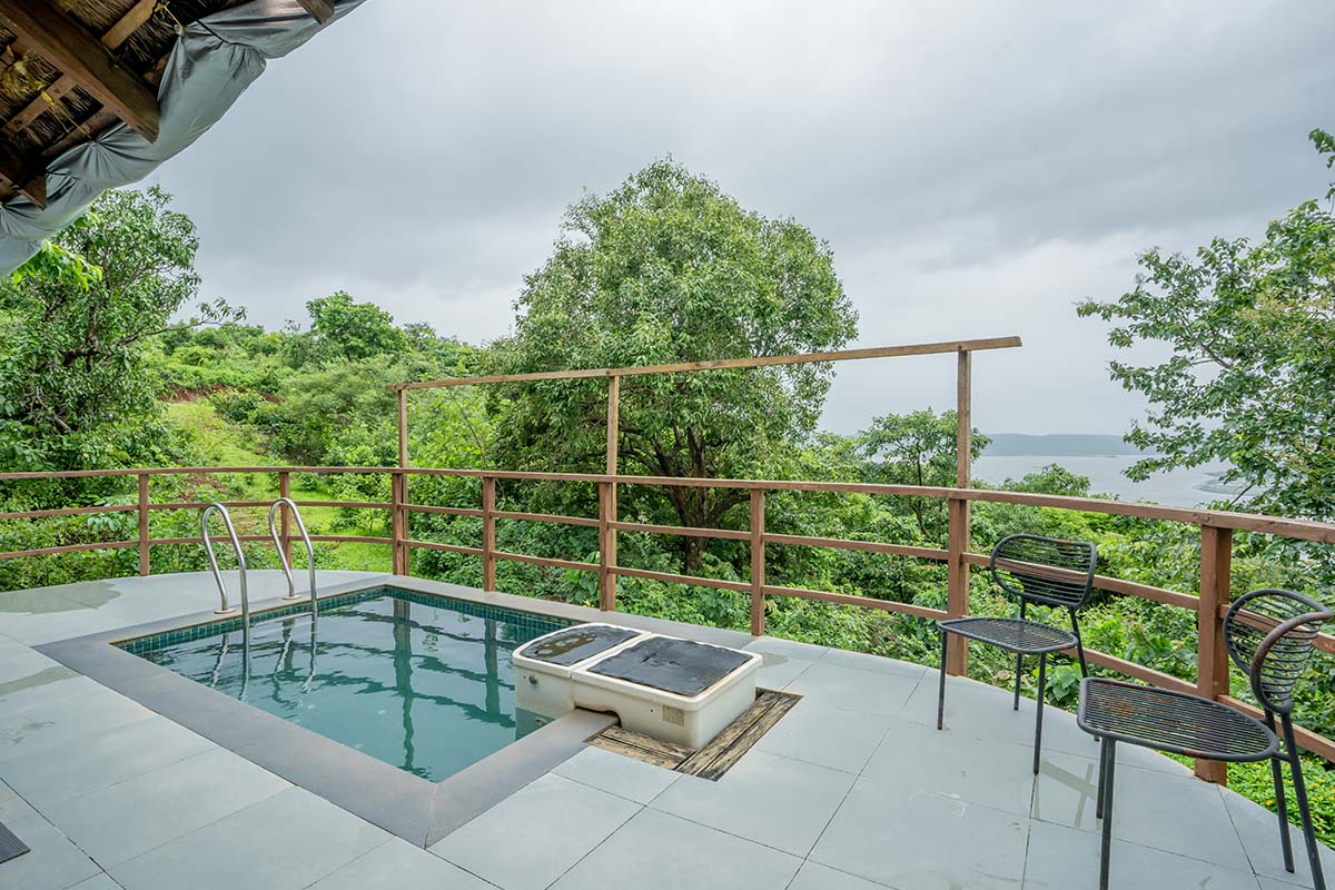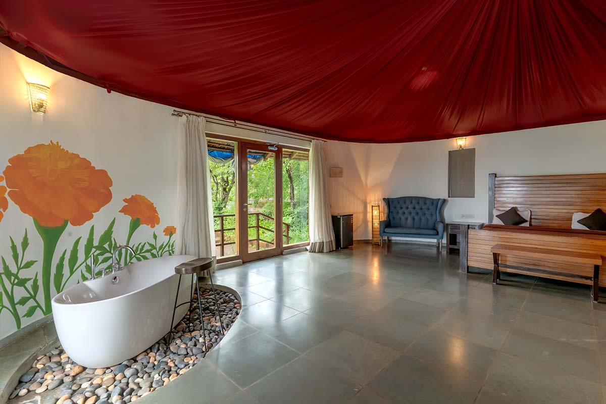 You cannot resist the allure of the Hermitage Marigold, which is the best combination of luxury and functionality. A queen-size bed adorned by a side table welcomes you that also has a convenient charging point on the side. There is also an equally irresistible 2-seater sofa where you could lounge for hours together before you even try to venture out. A mini-fridge helps you store cool refreshments, while a wardrobe safeguards your treasures. Use the lock-in combination safe to keep your valuables. Organised grandeur meets elegance as your every comfort is taken care of comprehensively. Get some leisurely soaks in the bathtub as a companion sits at the wooden stool next to you. The en-suite bathroom has a shower area with a basin and mirror. Your balcony opens up to a small and pretty pool with views of the expansive Arabian Sea as your backdrop.