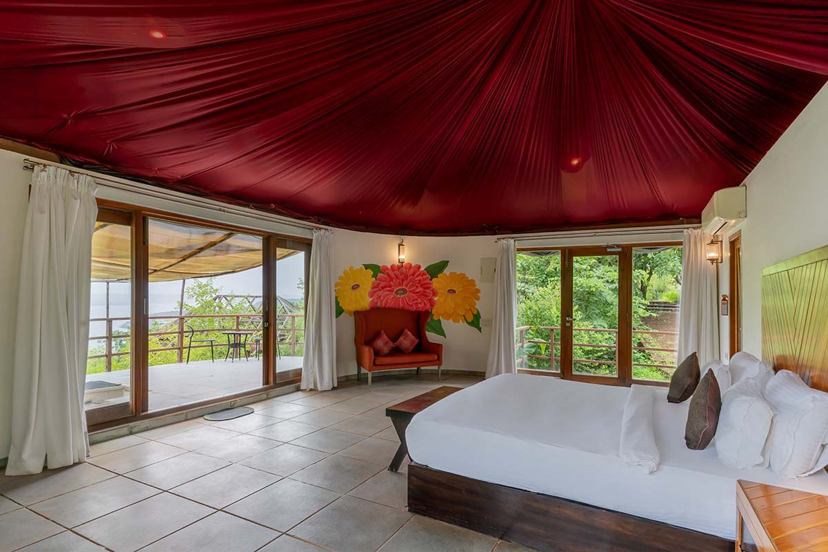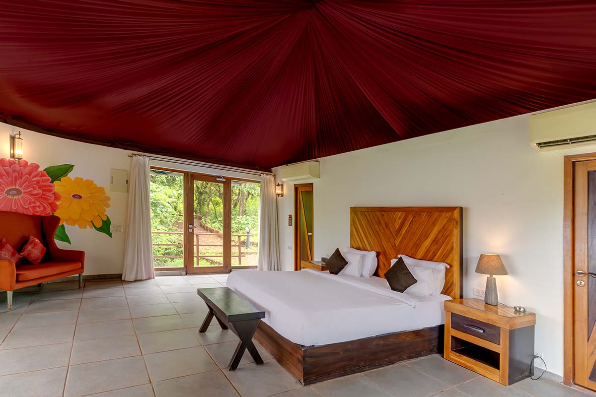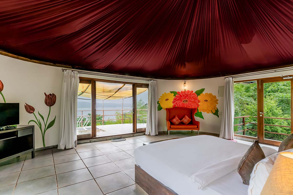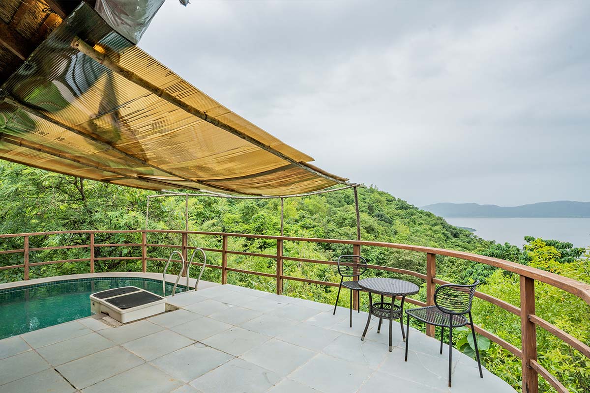 Hermitage Zinnia is the epitome of luxury and a haven of unparalleled indulgence. A sprawling, comfortable king-size bed calls you and promises nights (and days) of blissful slumber. The private balcony opens to a convenient little plunge pool where you can simply submerge yourself in serenity. While a snug 2-seater sofa beckons you for leisurely lounging, the in-room amenities are lavish, with a full-size mirror and a pantry. Stock your mini-fridge with essentials, or make coffee and tea to your own tastes with the coffee maker. A quaint bench lets you sip your brew when you are in deep contemplation. There’s an ornate mirror in the bathroom is flanked by twin basins, and a gorgeous shower room with hand shower promises the complete experience.